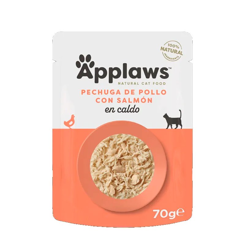 Applaws Pechuga de Pollo con Salmón en Caldo es un alimento complementario 100% natural para gatos adultos que no contiene nada más que los ingredientes enumerados.