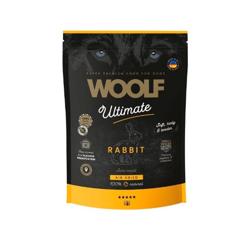 Conejo fresco 45 %, cerdo fresco 30 %, pescado fresco 10 %, almidón hidrolizado, glicerina, pulpa de remolacha, comino, WoolfGastroprotect (aceites esenciales (orégano, tomillo, romero, canela de Ceilán, clavo), extracto seco de té verde, B-glucanos y manooligosacáridos (MOS) extraídos de Saccharomyces cerevisiae), vinagre tamponado. Aditivos nutricionales: vitamina A 12 000 UI/kg, vitamina D3 1000 UI/kg, vitamina E 50 mg/kg, vitamina K3 1 mg/kg, vitamina B1 1,33 mg/kg, vitamina B2 4 mg/kg, vitamina B6 2 mg/kg, vitamina B12 22,5 µg/kg, ácido nicotínico 20 mg/kg, ácido pantoténico 10 mg/kg, ácido fólico 250 µg/kg, biotina 150 µg/kg, Cloruro de colina 250 mg/kg, Óxido de manganeso 20 mg/kg, yodo (yoduro) 1 mg/kg, Zinc 100 mg/kg, Cobre 10 mg/kg, Hierro 80 mg/kg, Selenio 250 µg/kg.